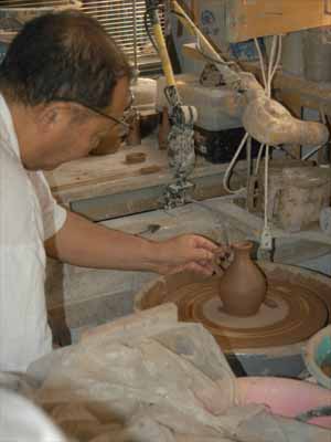 ロクロの上で土の塊が手品のように形を変えていきます。