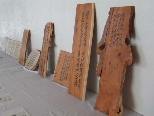 | 土田さんの漢詩。作品がいずれも板に書かれているのは、ご自身が最近まで木工工房を営んでいたという経歴から。 8月に北見市で開催された「漢詩とポーセラーツ作品展」の一部を展示しているもの。「ポーセラーツ」とは、磁器に絵付けをして高熱の電気窯で焼いた工芸で、土田さんのご家族が取り組んでいるもの。今回は展示されていません。 |