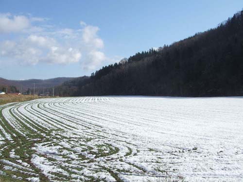 青青とした畑に雪が積もっている風景って、どうしても違和感ありますよね……。