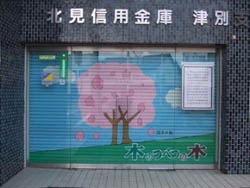 津別では一年中咲いている桜の木。北見信用金庫津別支店のシャッターに描かれた、双子の桜です。
