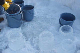 | 答えはこれ。アイスキャンドルの氷を作っていたのです。バケツに水を張って一晩……翌朝、バケツの外側にぬるま湯をかけ、「ピシッ」という音(バケツと氷が剥離する音?)がしたらひっくり返してストン。完成です。 |