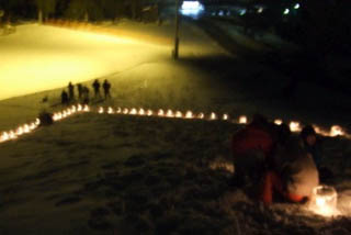| これです。 毎年紹介しております、「双子の桜ハートキャンドル」です。バレンタインデーに、共和の「双子の桜の丘」の下に灯される炎。百個のアイスキャンドルによって、形作られます。双子の桜ファンクラブによる作です。クラブの会長は、さきほどの名人です。 |