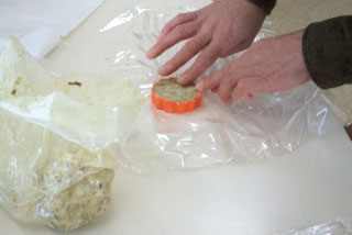 | 最後に、好きな型にはめ込みます。揉んだ後の石けんが粘土状になっているかというと、結構おおざっぱな粒の塊になっています。なので、型に凹凸が出来てしまい、大変気になりました。なぜ気になるかというと、結局自分も参加して作っていたからです。 |