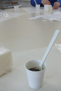 | おちょこサイズの紙コップと、豆腐1丁サイズの固形石けん。この固形石けん(石けん素地という)を加工して作るわけです。この石けん素地の油に保湿成分が入っています。なので、肌がつっぱらずになめらかな使い心地なのです。 |