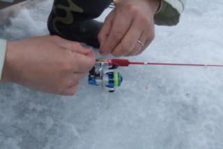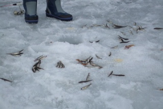 | 誰かが釣った、穴の跡。放っておくと、表面がすぐ凍っていきます。 |