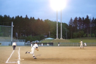 週刊@つべつでもご紹介しておりますが、津別ナイター野球2008(主催:津別町野球連盟)が開催中です。画像は、マルティックス対タイタンズの試合中の様子です。なぜ私がこのアングルから撮っているかというと、この日の一塁塁審だから(笑)。公式大会ではないので、審判免許はなくてもできるのです。それにしても、カクテル光線がまぶしい。