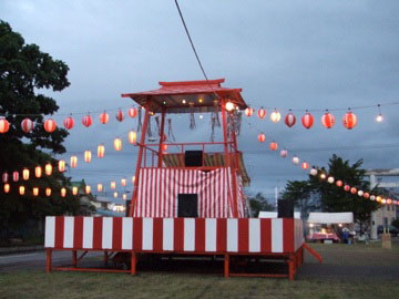 | 8月16日夕方の、津別神社境内。 つべつ納涼盆踊り(主催・津別観光協会、つべつ納涼盆踊り大会実行委員会)のための、やぐらが設営されています。 |