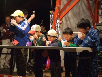 | しかし、雨も夜には止んで、開催の花火が上がりました。で、いきなりですが、子どもの仮装盆踊りの表彰式です(笑)。本当は踊っているところを撮りたかったのですが、つい一緒に踊ってしまったために、撮れませんでした。 |