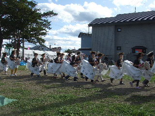 | 9月9日から、第18回ふるさとまつりと、神社例大祭が行われました。これは、ふるさとまつりの会場からとった、おみこし行列のひとこま。伝統ある駒踊りです。 |
