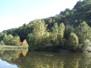 | ゴール左側に見える橋を、渡ったところにある池です。こんな平地でも、すでに紅葉がかっていました。来週のマラソン大会当日、コースの紅葉がどれくらい見事になっているのか……楽しみですね。 |