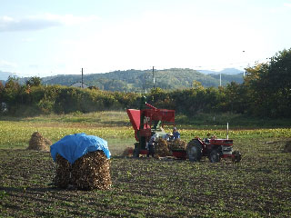 9月20日掲載分で、にお積みの画像を紹介しましたが、あれは積まれたにお。これは、本当のにお積み風景です。とても忙しそうですが、こうして切り取ってみると牧歌的です。