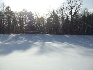 | 峠道をグルリと上ったてっぺん。相生開拓です。雪原に、柔らかい影が伸びています。 |