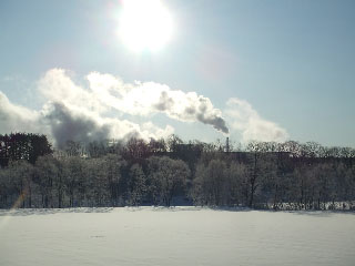 | 樹氷から網走川をはさんだ向こうは単板工場。 単板工場の煙突から、水蒸気がモウモウと立ち上っています。 |