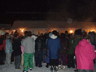 | かき氷早食いの見物人。この寒そうな競争に、すごい人だかりが。これもキャンプファイヤー同様、寒くても熱かったぜ。 |