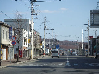 | 五差路のモニュメントをはさんで反対側。国道240号線です。すっかり雪もとけました。道の向こうには、まだまだ真っ白な雌阿寒岳が頭を出しています(見えるかな?)。 |