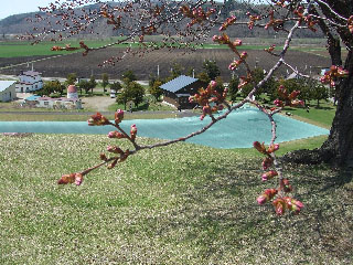 | お隣の、双子の桜の丘にのぼってみました。 こちらは、標高(?)が高い分、例年平地より咲くのが遅れます。ご覧の通り、まだつぼみばかりです。 |