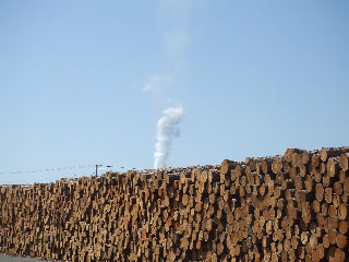 市街地への入り口で、たくさんの丸太がお出迎えしているのは、木の町の面目躍如です。
