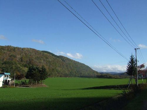 | 道道屈斜路津別線に沿って、美都にやってきました。 広く続く畑の緑に、かろうじて色を残す紅葉の山。 華やかではないけれど、美しかったので一枚撮ってしまいました。 |