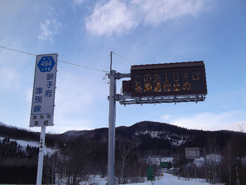 | 週末はまた冷え始めました。雪こそ降らないものの、朝晩は連日、マイナス10度以下です。 ここは、双葉と本岐の境界付近。道道訓子府津別線です。 電光掲示板にあるとおり、この先10キロで冬期間通行止め。チミケップ湖までは行けません。 |