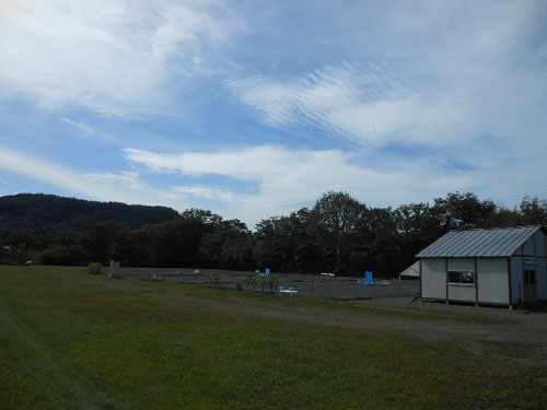 | ところで津別高校、かつては別なところに建っていました。 ここが旧校舎の跡地です。 同じ共和ですが、元の校舎は津別川のほとりにありました。 木々の向こうを津別川が流れています。 |