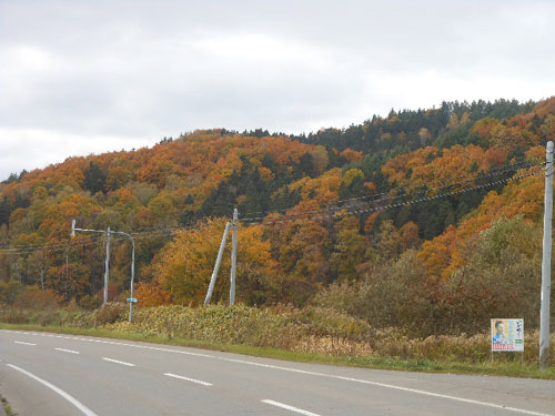 市街地で、黄色がちな山々が紅葉を偲ばせています。