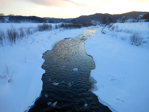 | 達美橋から、夕暮れの網走川を見下ろします。 |