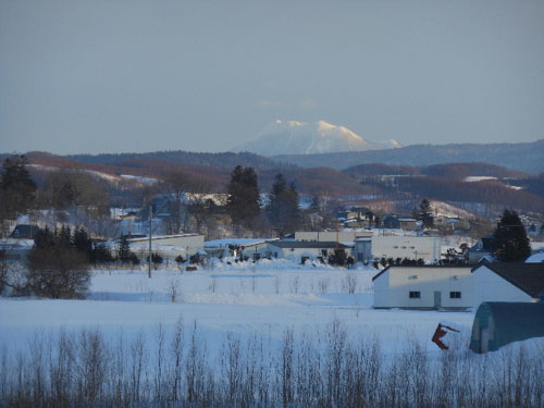 | 雌阿寒岳は、最初の写真の真ん中へんに見えています。 同じ写真の左端には、雄阿寒岳が写っているのが、分かりましたか? これが、雄阿寒岳の拡大写真です。 真下に写っている建物は、共和町民スキー場の展望施設「三角点」です。 |