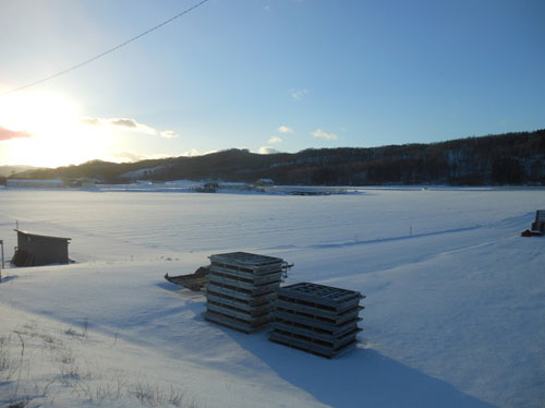 | 所変わって、岩富地区。 折からの雪で、津別の景色はただいま真っ白です。 玉ねぎ畑もこのとおり。 市街地はとけてしまうと思われますが、農村地区ではホワイトクリスマスになりそうです。 |