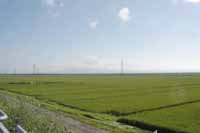 迷路を国道まで戻り、津軽平野の田んぼの中をひた走ると右手に山すそが綺麗な独立峰「岩木山」が見えてきます。