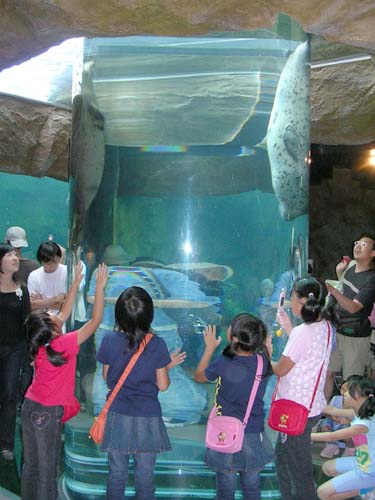 | 日本一の入場者数というだけあってお盆を過ぎてもかなり混雑ぶりです。6月にオープンしたばかりの「あざらし館」がやはり人気で日中は30分以上待たされますが、3時を過ぎるとゆっくり見れます、パイプの中を泳ぐゴマフアザラシのひょうきんな泳ぎに釘付け。シロクマ館やペンギン館、オランウータンなどいろいろな角度から動物たちのおもしろい動きが見られ、主役の動物たちが標本ではなく、ただ可愛いだけではない点が人気の的なのかな。ちなみに、オランウータンの綱渡りは必見、おやつの時間(もぐもぐタイム)の30分くらい前に行って待っているのがポイントです。 |