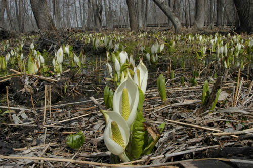 国道238号線湧別町内芭露地区のミズバショウ群生地では白い花が四分咲きほどになりました。来週あたりが見ごろになりそうです。