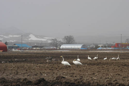 湧別の東地区ではシベリアに帰る途中のオオハクチョウとヒシクイが畑で羽を休めています。