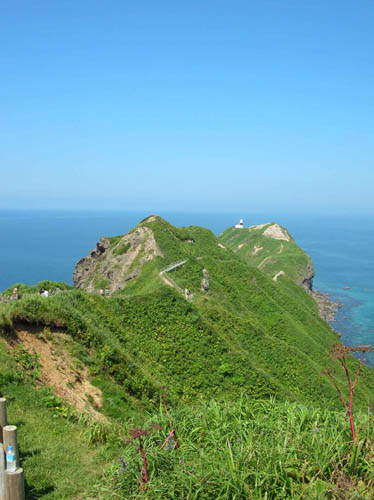 | 二岬めぐり(神威岬・積丹岬) 神恵内から真っ青な日本海を左に国道229号線を積丹へ、岩肌にポッカリ穴の開いた「窓岩」、塩谷の窓岩より窓らしく中央に穴が開いていました。その奥には西ノ河原のゴツゴツした岩山がオドロオドロしく見えます。 神威岬トンネルを抜け岬へ向かう道に左折、気温30度を越す猛暑の中「女人禁制」と書かれた関所をくぐり万里の長城を思わせる道のりを20分息も絶え絶えで神威岬灯台に到着、神威岩をバックに証拠写真を撮って引き返すこと往復40分、運動不足の身にはかなりキツイですが苦労が報われるここの絶景は必見です。 国道へ戻り覆道の連なりを抜け積丹岬へ・・・・急勾配を登りつめ相変わらずの灼熱地獄、島武意(しまむい)海岸に通じる人がすれ違うのがやっとの小さなトンネル内はヒンヤリと出たくないほどですが連なる観光客で立ち止まることができず、真っ暗なトンネルを抜けると眼下に広がるシャコタンブルーの海岸線、日本の海岸百選に選ばれたのがうなずけます。 トンネルを戻り案内看板を見ると「右手300メートル岬灯台」の標記に先端症候群感染症の親子はためらうことなく突き進み・・・・ほどなく距離表示と舗装路面にだまされたことに気づき「心臓破りの丘」「胸突き八丁」という言葉が脳裏をよぎる坂道をあえぎながら登りつめ執念の先端制覇。 景色を眺める余裕もなくベンチに倒れこみ大休止!噴出す汗を拭いつつ証拠の写真撮影をして退散、下りはひざと太ももがピクピクし、アクセルを踏む足がツリそうになるのを抑えつつ国道229号線を積丹市街から古平でひと回り、海も山も両方楽しめる積丹半島でした。 |
