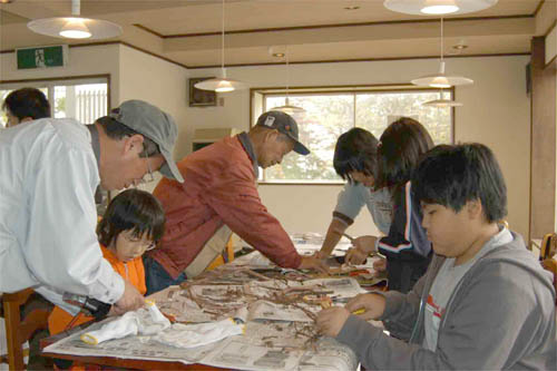 サロマ湖畔の遊園地Family愛LandYOU隣接の「いこいの森」でしらかばの植樹と木や枝を使ったフリーウッディーの森林体験学習をしました。丸太の輪切りに悪戦苦闘・・・木の年輪や樹皮の模様、木肌の色などをうまく使いいろんな作品が出来上がりました。