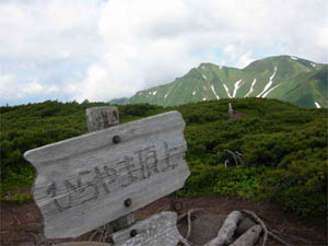 小さな雪渓を過ぎ第2雪渓も一気に登りきり、ハイマツ群の中を抜けると景色が開け稜線の分岐、ここまで2時間10分。左は平山(ひらやま)山頂、右は比麻良山(ひまらやま)の標識、へっぽこ登山隊は当然山頂に向かうルートで、馬の背状の花畑は帰りに見ることして、2時間40分で山頂に到着。