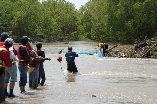| カヌーで湧別川のゴミを拾うクリーン ザ リバーinゆうべつ川カヌー清掃は、上流の大雨でコーヒー牛乳のように濁った水の中、真夏のような日差しと気温に恵まれ中学生から土建屋さんまで27人が参加し、500キロのゴミを集めました。 大物はテレビやホイル付きのタイヤ、相変わらず多いのはペットボトルや肥料袋でした。 参加者のほとんどが初めて乗るカヌー・・・・・心配が的中しゴールまで1キロ程のところで、川の真ん中に溜まった流木に3艇が張り付いてしまいましたが人もカヌーも無事でした。YU-PAL名物高齢レスキューチームが活躍し、普段はめったに見られない緊迫した状況の中、迅速な救助とカヌーの回収に参加者からは「良い経験ができた?」との声も聞かれました。 |