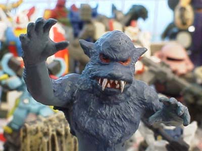 | 狼男 確か初代の最高幹部のゾル大佐の変身した姿だったと思いましたが。ゾル大佐って片目だったような気がします。まぁ最高幹部で気になるのはやはり「死神博士」ですよね。怖かったもん。そのフィギュアもあるんだべなぁ。まだ撮ってないけど。 |