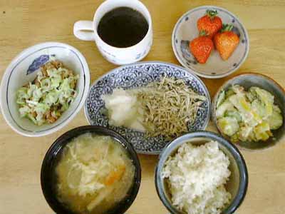 | ・ご飯(五分搗き、130g) ・味噌汁(ニンジン50、タマネギ180、揚げ50、味噌80)×1/6 ・ジャコ(10g)大根おろし(40g) ・ホッキのサラダ(市販ホッキサラダ200、キュウリ100)×1/5 ・納豆(50g)刻みネギ(10g) ・イチゴ(3個) |