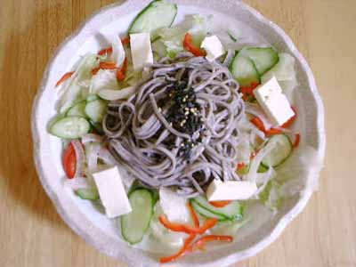 食べやすい大きさに切った生野菜の上に、茹でた蕎麦をのせて、和風か中華のドレッシングをかけていただく。この日は、ゴマオイルに中華だし、砂糖少々に醤油・からしを混ぜて作りました。