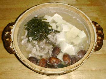 昆布をつけておいた鍋を火にかけ、材料を入れて煮る。