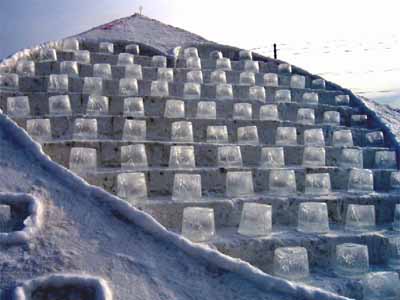 | 天然氷のすべり台の上には、なんと「雪のアリ地獄?」があります。このシンプルなつくりが、子どもたちには大うけでした。 |
