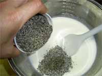 (3) 氷水にあてながらあら熱をとり、完全に冷めたら、生クリームを入れる。 少しとろみがつくまで混ぜ、黒すりごまを加える。 |