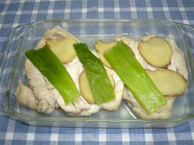 とり肉に塩をまぶして耐熱の器にのせ、長ねぎとしょうがをその上にのせて、電子レンジで熱をとおす。(600Wなら肉200gに4〜5分が目安) 蒸し器で蒸す時は10分〜15分が目安です。 |
