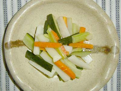 | ●材料 きゅうり、セロリ、人参、大根など野菜合わせて・・・300g 酢・・・・・・・・・・・・・・・・・・・・・・・・大さじ2 砂糖・・・・・・・・・・・・・・・・・・・・・・大さじ1強 塩・・・・・・・・・・・・・・・・・・・・・小さじ1/2強 サラダ油・・・・・・・・・・・・・・・・・・・大さじ1/2 |