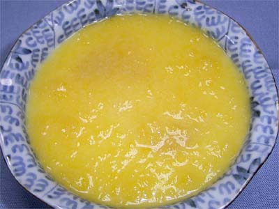 黄桃缶(マンゴー缶でも)をザクザク切りし、缶詰の汁少々とミキサーにかけペースト状にする。(キウイフルーツなどをペースト状にしたのでもOK) |